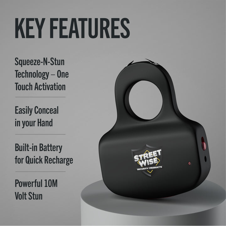 When seconds matter, complicated controls are the enemy. The Streetwise Sting Ring solves that with a patented ring design and Squeeze-N-Stun activation—tighten your grip and the power is ready. That single, intuitive motion is why this model is a favorite for runners, walkers, night-shift commutes, and anyone who wants a truly one-handed self-defense tool.