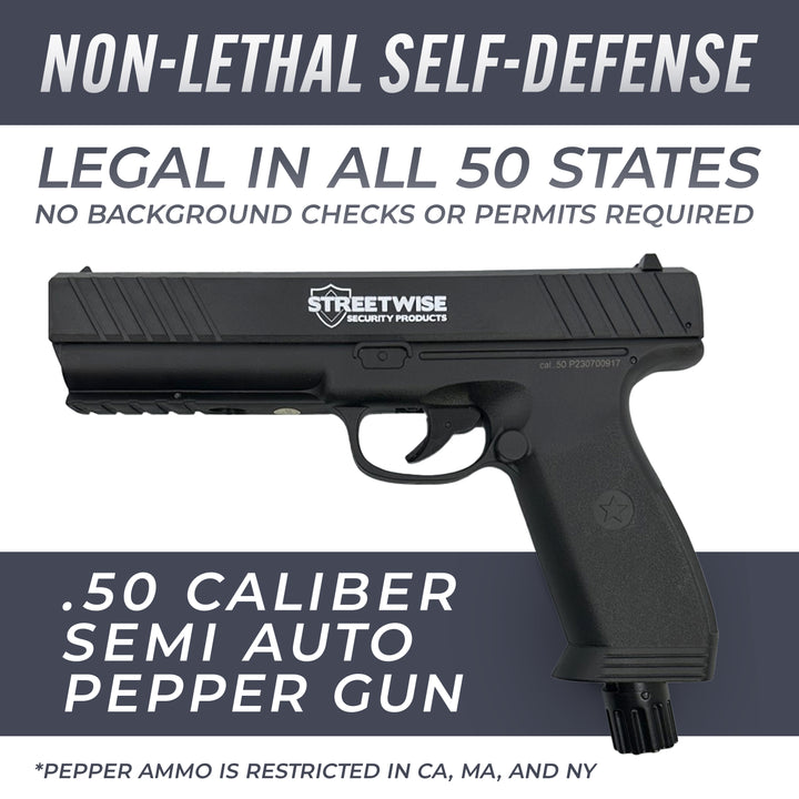 Distance changes everything. “The Heat” Pepper Launcher lets you create space and end a threat before it reaches you. This compact, semi-automatic .50-cal platform feeds from a 6-round magazine and runs on standard 12 g CO₂, so it’s fast to stage, simple to operate, and easy to keep ready.